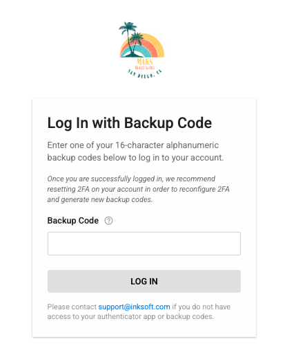 It is important to keep your backup codes accessible. If you lose access to your authenticator and your backup codes, InkSoft support can assist during regular business hours. If you do use one of the codes to login, you will be unable to use that same code again. We strongly recommend resetting 2FA (as detailed above) on an account that has used more than one of its backup codes, so that you can generate new ones.