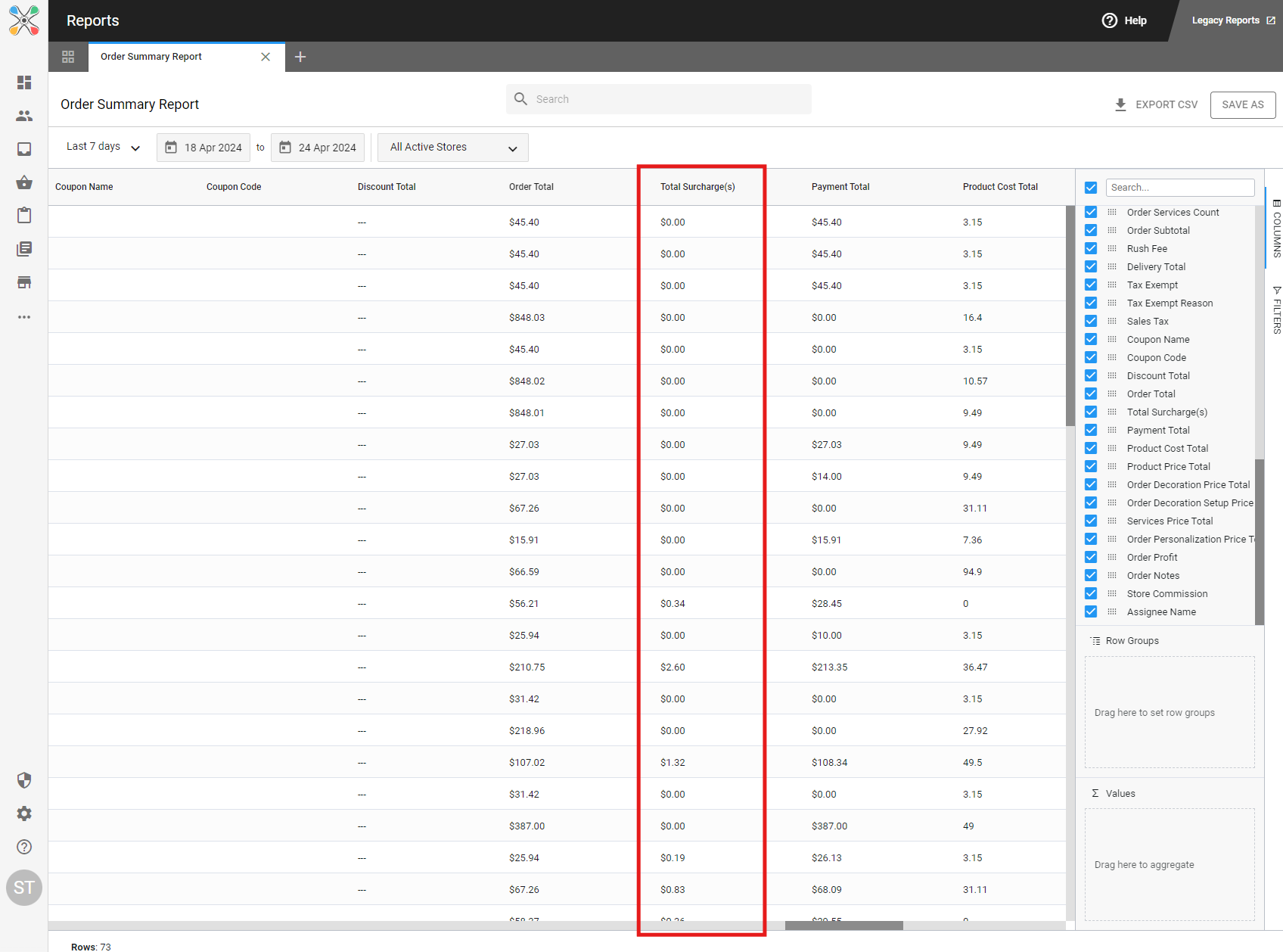 Surcharges can be found on any order or transaction-level report. This includes: