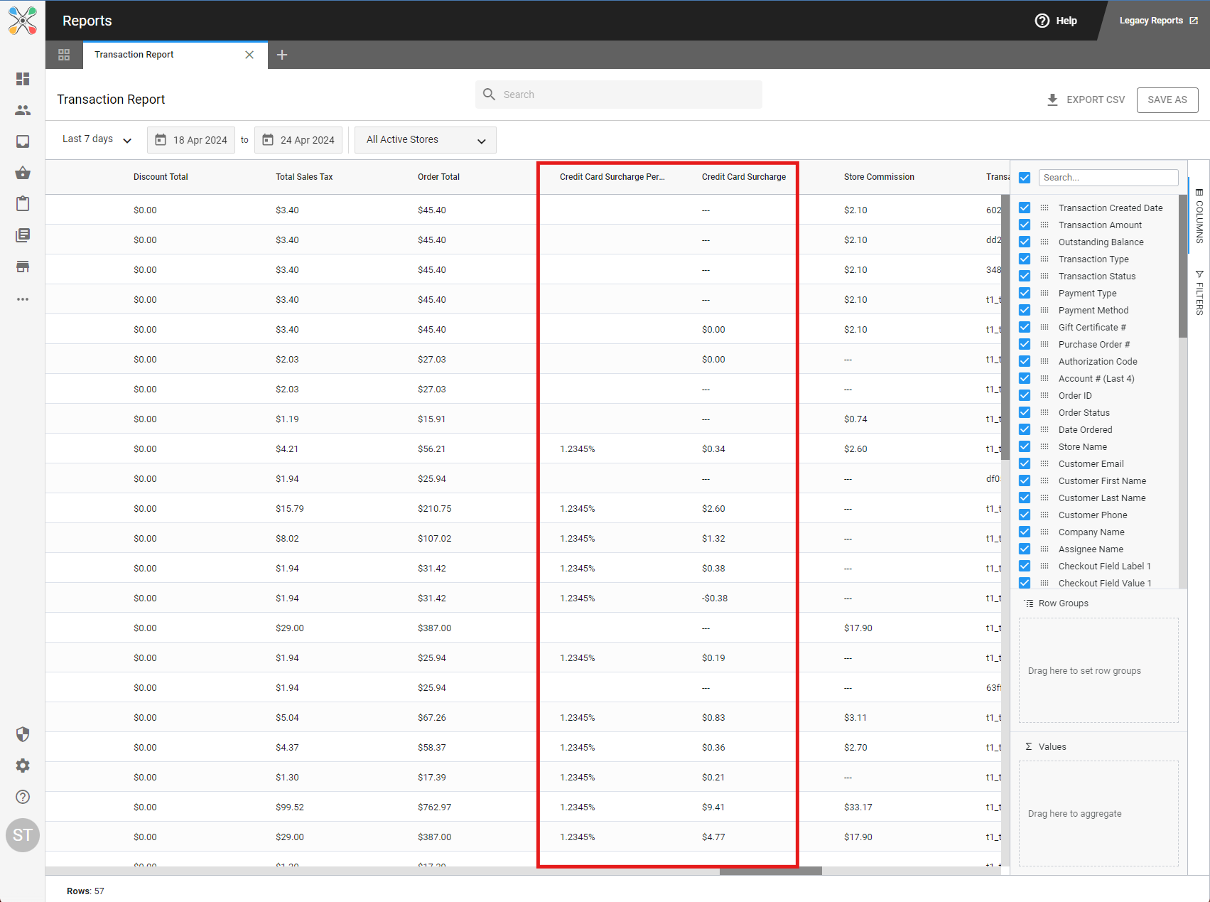 The Transaction Report will return every processed transaction (which means a single order can have multiple transactions, if it's paid in installments). This report will show the Credit Card Surcharge, as well as the Surcharge Percentage as columns, for each transaction.