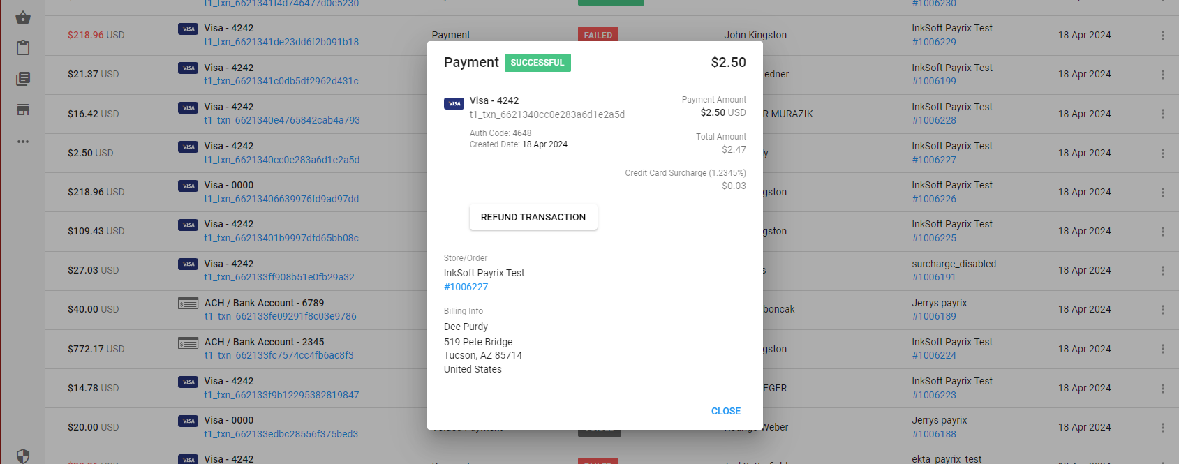The transaction details card contains a lot of the same information as the list view, in addition to the cardholder and billing information, the auth code, surcharge amount, and a refund/void action.