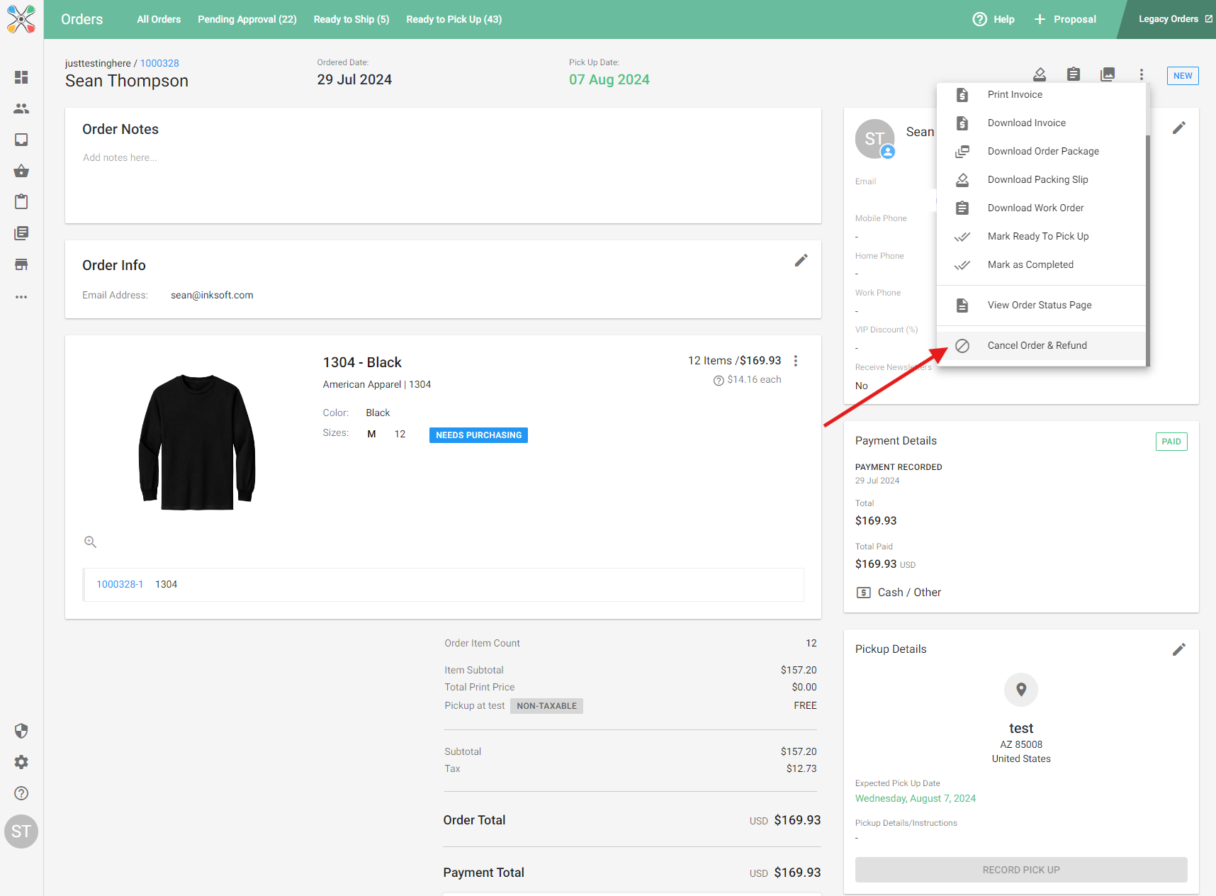 To cancel and refund an entire order, simply navigate to the order in question, click on the three dots in the upper right corner, and select "Cancel Order & Refund".
