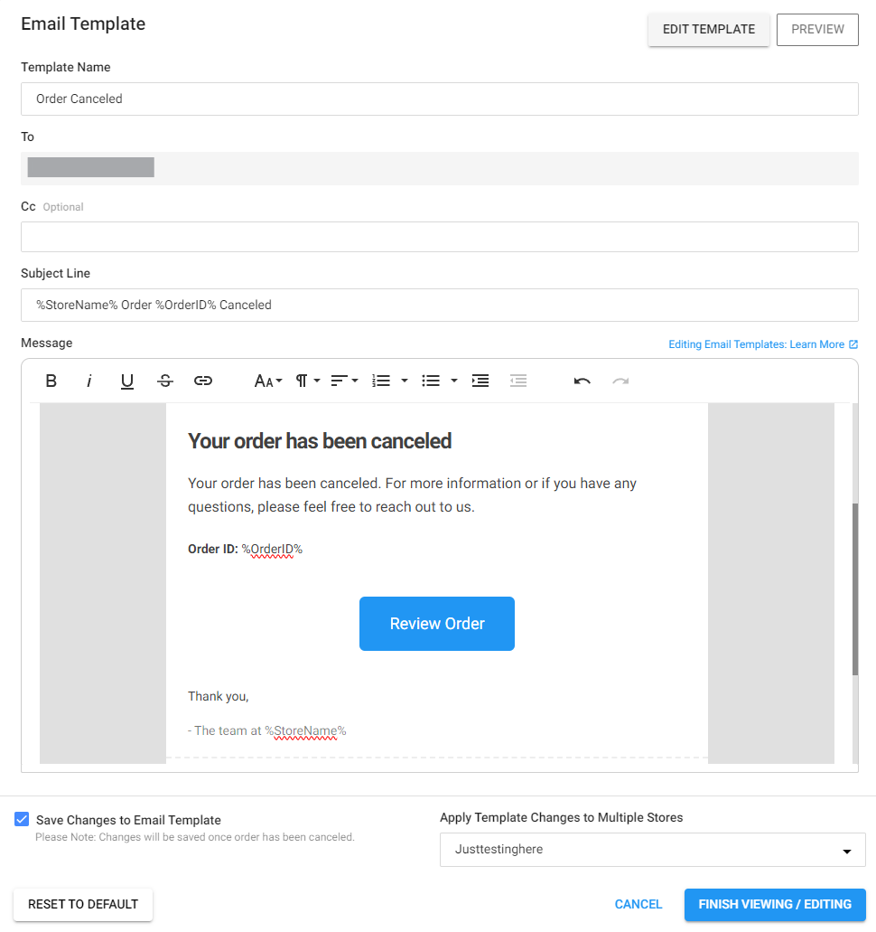 The Cancel Reasons in the dropdown are pulled from your Email Templates. While these can be created and edited in the dedicated Email Templates section of the Dashboard (more info here), they can be edited within this Cancel Order workflow to suit the individual needs of an order.