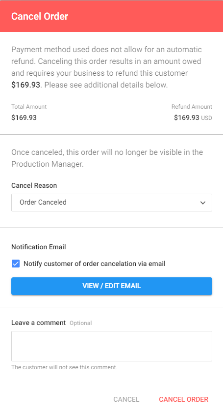 Once the email is to your liking - or if you've opted out of communication - you simply need to press the "Cancel Order" button on the popup. Once this is pressed, note that any payments made via Payments will be automatically refunded, for the order in its entirety. Record of this refund can be found within the Payments section. Additionally a Timeline event will be added on the bottom of the order showing the selected template with a link to the viewable email.