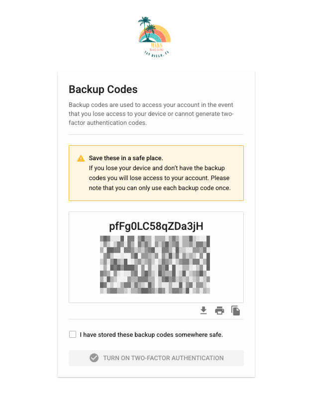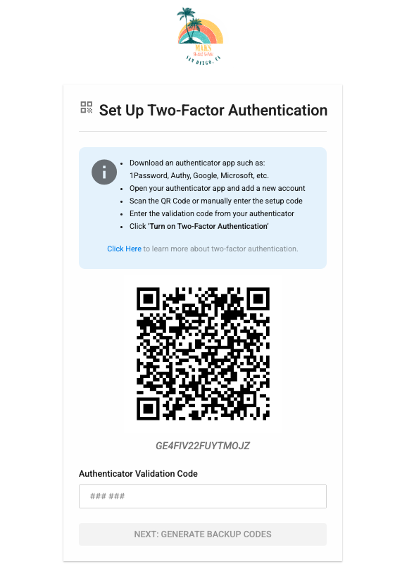 Simply follow the steps outlined there within your authenticator app of choice. Then click "Generate Backup Codes". This will bring you to an important screen: