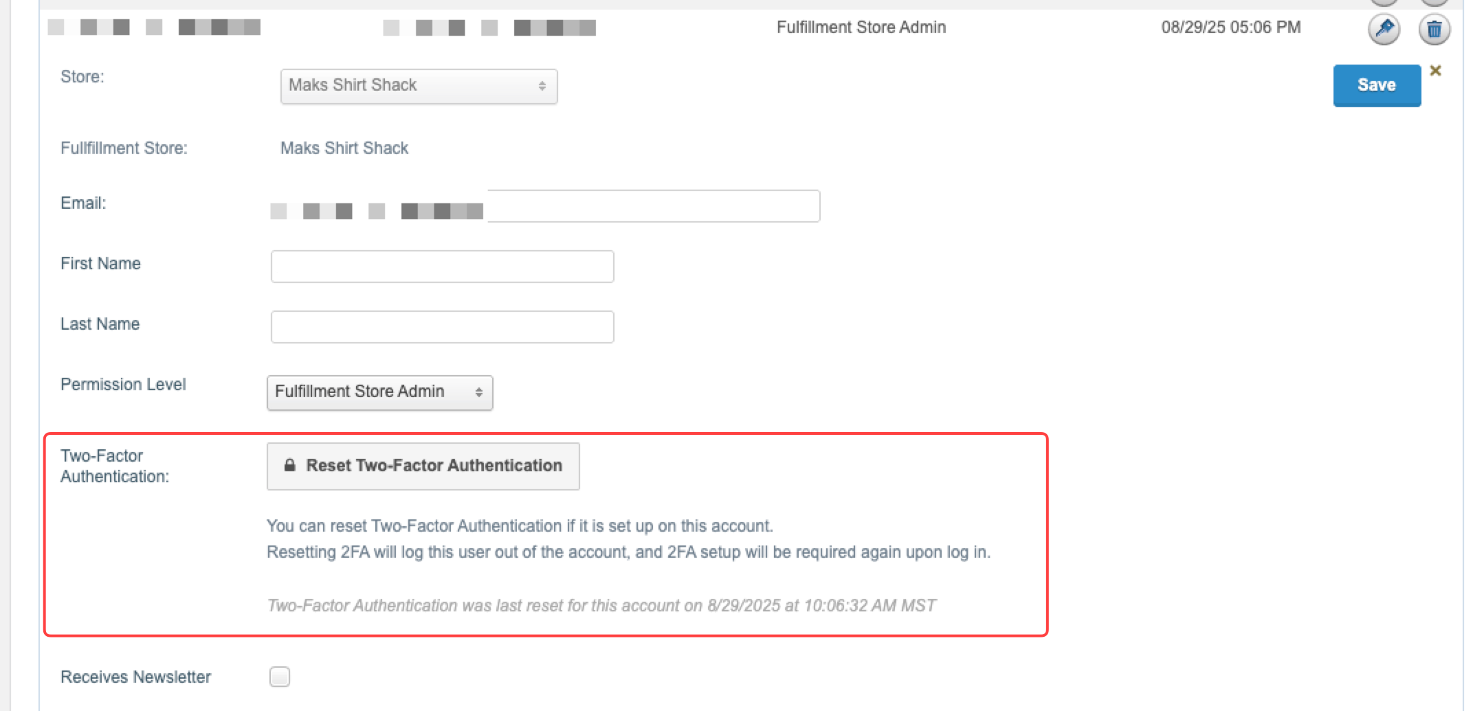 If you currently have 2FA enabled, choosing to disable it here will remove previous 2FA configurations from all fulfillment store admin accounts. If you then decide to re-enable 2FA again, it will require a fresh setup upon login - previous codes will not be accepted.