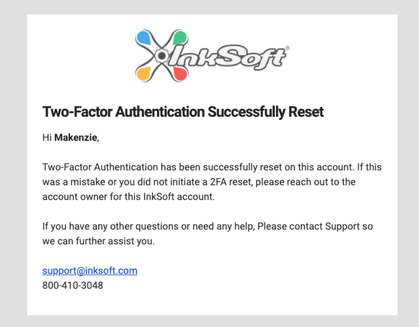 It is important to keep your backup codes accessible. If you lose access to your authenticator and your backup codes, InkSoft support can assist during regular business hours. If you do use one of the codes to login, you will be unable to use that same code again. We strongly recommend resetting 2FA (as detailed above) on an account that has used more than one of its backup codes, so that you can generate new ones.