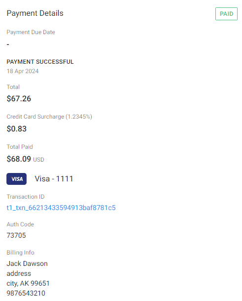 Payment details gives you the high-level payment information your shopper entered for their order. This information coincides a bit with what your Cart Settings are set to; i.e. Purchase Order Number, Credit Card used/last four digits of the card shown, Arrange Later, Transaction ID, Surcharge amount, etc.